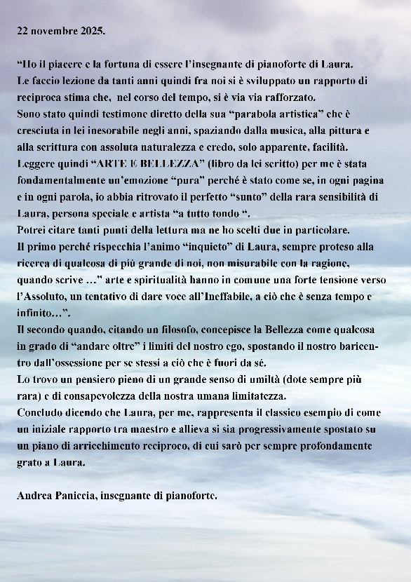La ricerca di Laura, oltre che artistica, è ricerca di armonia con ciò che contempla, con tutto quello che riesce a comunicarle, a “corrisponderle” le vibrazioni che la stupiscono, affascinano, suggestionano e che, soprattutto, possano metterla in contatto con il senso nascosto del percepito e renderla “docile fibra dell’universo”.