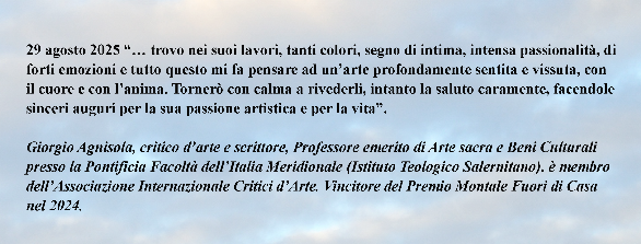 La dominanza tonale si incammina verso il freddo o al limite ai colori primari, segno che l’espressività rimane adombrata ad una ricerca di assoluto puro che lascia intravedere alcuni interessanti richiami alle sperimentazioni novecentesche che ritornano da una memoria iconografica profonda: è il caso … della donna distesa, su fondo marino notturno e sfumato - secondo me l’opera più interessante del lotto - in cui si mescolano le muse classicheggianti del De Chirico metafisico, le oniriche costruzioni del Dalì più surrealista ed i segni cabalistici di Paul Klee.
