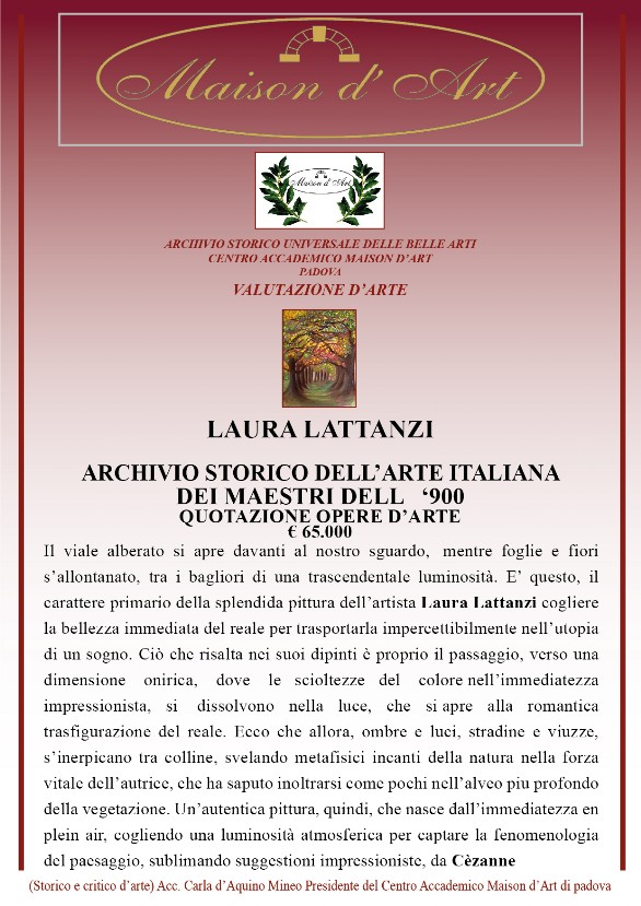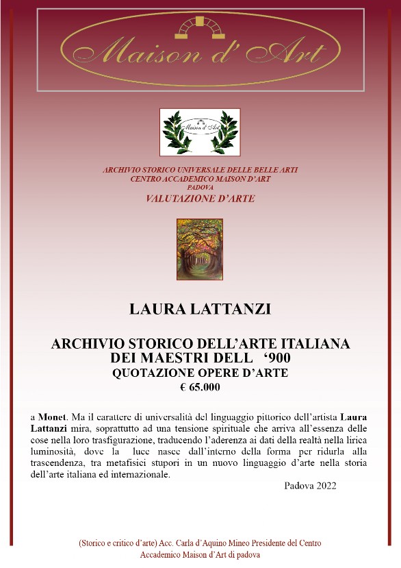 C'è in Laura Lattanzi una trascrizione della realtà, che è sublimazione emotiva dei suoi stati d'animo che divengono anche di chi guarda: documenti intimi che ci lascia vedere e condividere.